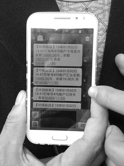银行短信显示,黄先生的18000元在存入不到1分钟后即被人转走。记者 龚化 摄