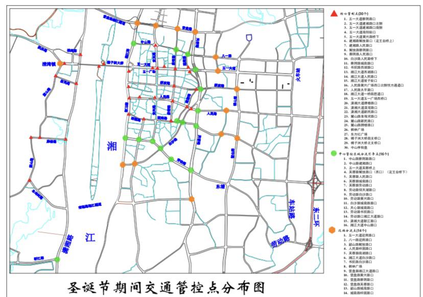 12 月 24 日、25 日 14 时至 22 时,长沙共设置 17 个外围分流点,视情采取卡放结合的临时性管制措施,控制入城交通流量,确保出城道路的畅通。特别是加大对工程运输车、货车、农用车、拖拉机等车辆进入城区的管制。