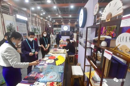 湖南非遗专题展示馆,14项湖南国家级非物质文化遗产亮相进博会。湖南日报首席记者 郭立亮 摄湘西的土家族织锦技艺、长沙的湘绣、益阳的黑茶制作技艺、浏阳的石雕(菊花石雕)、江永的女书习俗……非遗传承人现场演示制作过程、展示制作技艺,让海内外观众互动参与,感受湖南非遗魅力。