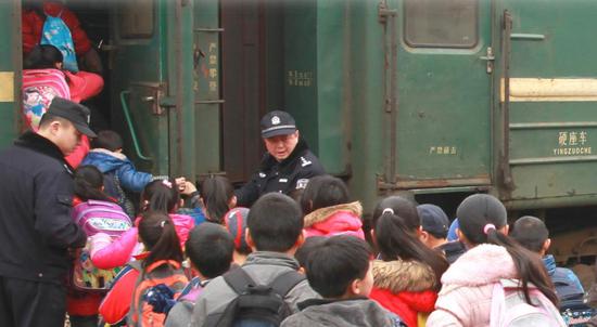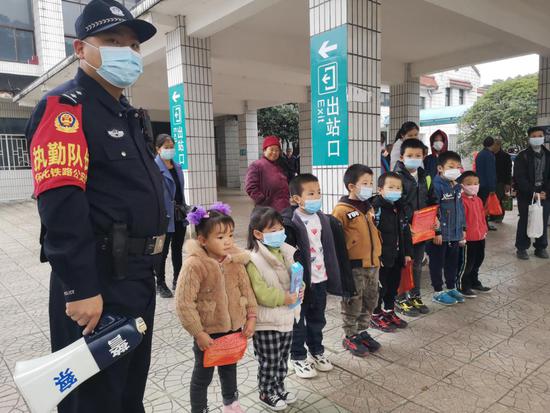 11 月 20 日星期五,在湖南通道火车站,铁路民警正在护送一批学生乘坐 7269 次短途列车,让他们周末平安走向回家的路。据统计,自 2005 年以来的 15 年间,靖州站派出所通道警务区民警共护送学生一万三千多人次,没有发生一起安全事故,受到学校和社会的一致好评。