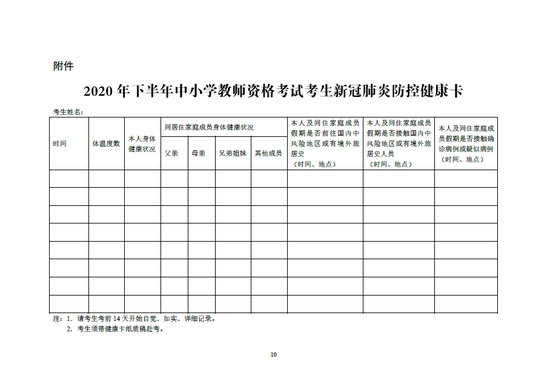(2)当前,我国新冠肺炎疫情防控工作已从应急状态转为常态化。为保障广大考生的生命安全和身体健康,保障考试安全有序组织,考生从考前14天开始,须自觉测量每日体温、如实记录并进行健康状况监测(新冠肺炎防控健康卡见附件),体温测量记录以及出现身体异常情况的,要及时报告。考生赴考点时,要提前准备好口罩(一次性使用医用口罩或医用外科口罩)、手套、纸巾、速干手消毒剂等防护物资,出行全程佩戴口罩,下车后应及时做好手卫生。