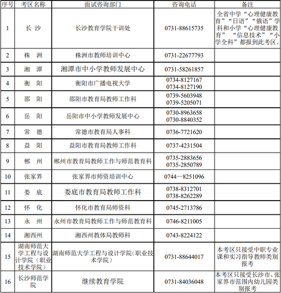 3。湖南省中小学教师资格考试面试各考区联系地址和电话如下表: