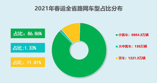 2021年全省高速公路小型客车流量为8,984.3万辆,占86.86%,较2019年同期下降1.6%;大中客车流量为138万辆,占1.33%,较2019年同期下降29.7%;货车流量为1,221.3万辆,占11.81%,较2019年同期增长30.71%。春运车型占比阶段性特征明显。