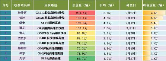 春运期间,车流较大的收费站主要集中在环长沙周边高速公路收费站。以长沙城东和城西两大出入口流量最为集中。其中G5513长张高速长沙西收费站出入口总量达231.4万辆,占长沙周边收费站出入口总流量的13.32%,峰值流量达7.7万辆;其次是G6021杭长高速长沙收费站,出入口流量195.1辆,占长沙周边收费站出入口总流量的11.23%,峰值流量为6.8万辆。