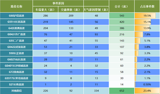 春运期间,全省高速共发生突发性事件2782起,其中因天气原因(大雾、降雨等)管制事件795起,占事件总数的28.58%,车流大的事件共发生1242起,占事件总数的44.64%,因交通事故引发的事件745起,占事件总数的26.78%。事件发生次数较多的路段集中在省内车流量较大的G4京港澳高速、G0421许广高速、G55二广高速、G60沪昆高速、G5513长张高速以及环长沙周边高速,如S50长芷高速长沙段、G6021杭长高速等。