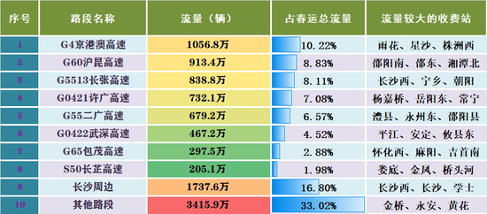 环长沙周边路段是车辆主要集散地,出入口总流量达1,737.6万辆,占春运期间全省总流量的16.8%,呈潮汐式分布特征。流量主要集中在G4京港澳高速、G60沪昆高速、G5513长张高速、G0421许广高速路段,G0422武深高速、G55二广高速,流量合计占假期总流量的45.32%。