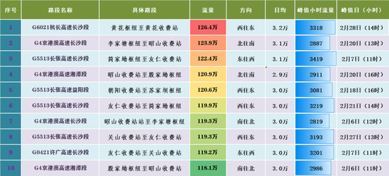 根据全省门架数据排行榜分析,断面流量排名靠前的路段主要集中在G4京港澳高速长沙段、湘潭段双向,G0421许广高速长沙段、湘潭段双向,G5513长张高速长沙段双向,呈现春运前南往北、东往西,春运后期北往南、西往东的潮汐特征。