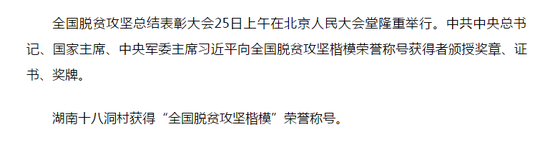 湖南十八洞村获得“全国脱贫攻坚楷模”荣誉称号