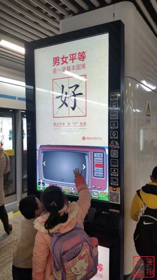 除了在机场、高铁站设立了宣传期为一个月的男女平等基本国策公益广告灯箱外,省妇联还在相关部门支持下,在长沙地铁2号线的133块查询机上注入男女平等基本国策宣传内容,在每天选择地铁出行的巨大客流人群中,进行为期一周的国策宣传。
