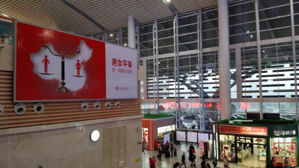在高铁长沙南站的进站大厅,设立在出发层扶梯旁的3块男女平等基本国策的公益广告灯箱在川流不息的客流人群中更加显眼,无论从哪个方向进入候车大厅的旅客,抬头均可看见设计简洁清新的广告。在到达层,同样也设有2块巨大的广告灯箱,给人留下深刻印象。