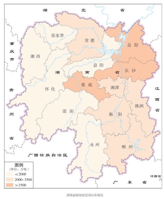 湖南省碳排放量总体呈现东高西低特点,其中长沙、娄底、岳阳碳排放量高于3500万吨;娄底、湘潭碳排放强度最高,高于1.0吨/万元,长沙、永州碳排放强度最低,低于0.5吨/万元。