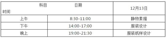 考试所需绘画工具、剪裁工具等自备。服装工艺考试具体时间、地点详细安排由考点另行公布,静物素描、服装设计、服装纸样设计考试时间统一安排如下: