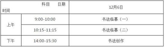 书法艺术和书法教育类考试全省考生随机编排在长沙市内若干考点,具体考试地点安排见《专业考试证》。考生须在考试前 3 天开始登录 “ 报名缴费指定系统 ” 打印《专业考试证》,12 月 5 日下午 17 点前往考试地点熟悉笔试考场。考生必须凭第二代居民身份证以及《专业考试证》在规定的时间和地点参加专业考试。考试时间具体安排如下: