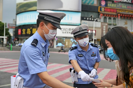 路面执勤交警告诉记者:“ 七夕当天,交警、劝导员在城区部分路口随机向安心等候信号灯的行人、骑行时佩戴头盔电动自行车驾驶人或礼让斑马线的机动车驾驶人派发一个七夕版定制口罩,为他们的文明交通行为点赞。”
