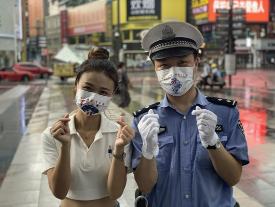 8 月 13 日,长沙市黄兴路步行街路口,不少市民发现路面执勤交警的口罩有了新变化,有的口罩上用书法写着 “ 礼让 ”“ 勿酒驾 ” 字样,有的则绘着情侣、喜鹊、祥云等 “ 七夕 ” 元素,让人眼前一亮。