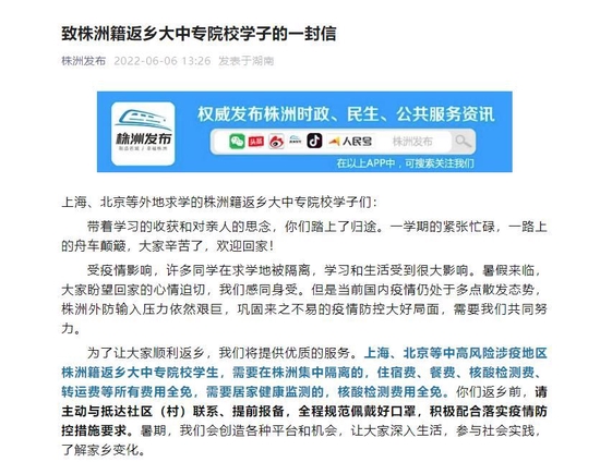 株洲发布 6 月 6 日下午发布了一则《致株洲籍返乡大中专院校学子的一封信》,内容表示,上海、北京等中高风险涉疫地区株洲籍返乡大中专院校学生,需要在株洲集中隔离的,住宿费、餐费、核酸检测费、转运费等所有费用全免,需要居家健康监测的,核酸检测费用全免。返乡前,请主动与抵达社区 ( 村 ) 联系、提前报备,全程规范佩戴好口罩,积极配合落实疫情防控措施要求。