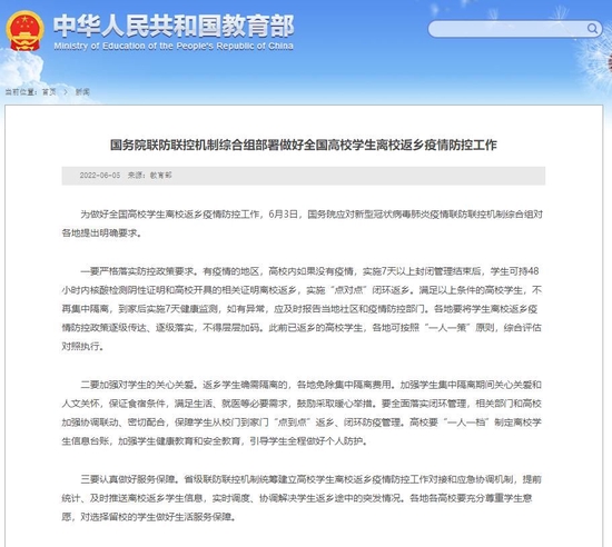 据教育部网站消息,为做好全国高校学生离校返乡疫情防控工作,6 月 3 日,国务院应对新型冠状病毒肺炎疫情联防联控机制综合组对各地提出明确要求。