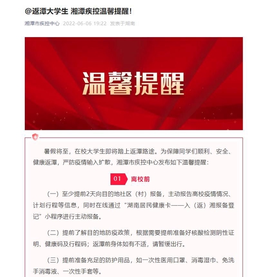 6 日晚,湘潭市疾控中心官微也发布了一则《@返潭大学生 湘潭疾控温馨提醒》,明确表示,对于有疫情的地区,高校内如果没有疫情,实施 7 天以上封闭管理结束后,学生可持 48 小时内核酸检测阴性证明和高校开具的相关证明离校返潭。
