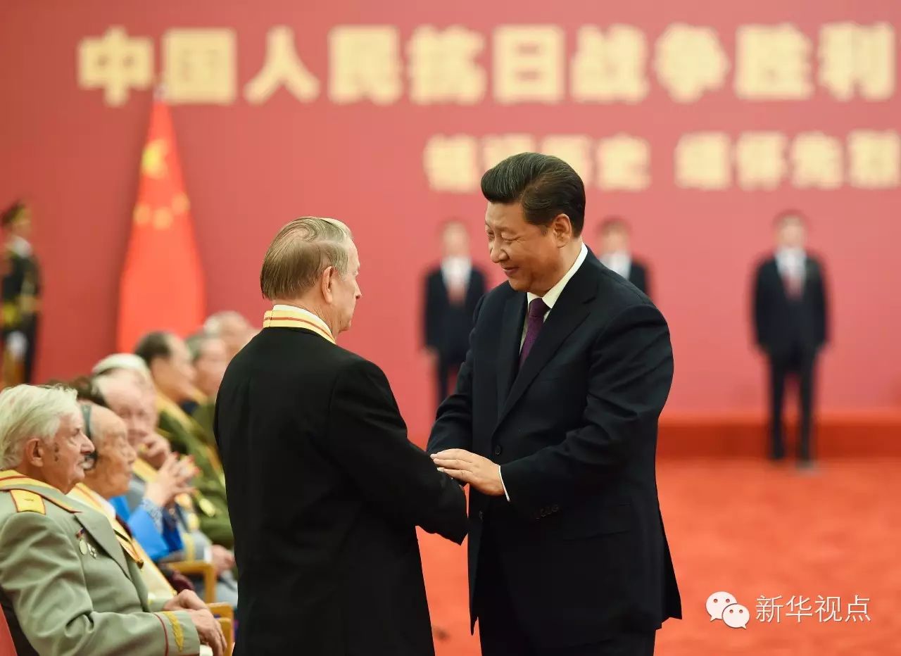 (9月2日,中共中央总书记、国家主席、中央军委主席习近平在北京人民大会堂向30名抗战老战士老同志、抗战将领、帮助和支持中国抗战的国际友人或其遗属代表颁发中国人民抗日战争胜利70周年纪念章并发表重要讲话。 新华社记者 谢环驰摄)