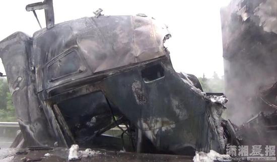6时35分,救援官兵到达现场后发现:发生剧烈碰撞的两辆货车致使追尾货车车头严重变形,玻璃碎片和车体零部件散落一地,整个车头成了一个巨大的“火球”。经过半个小时的努力,火势得到有效控制。