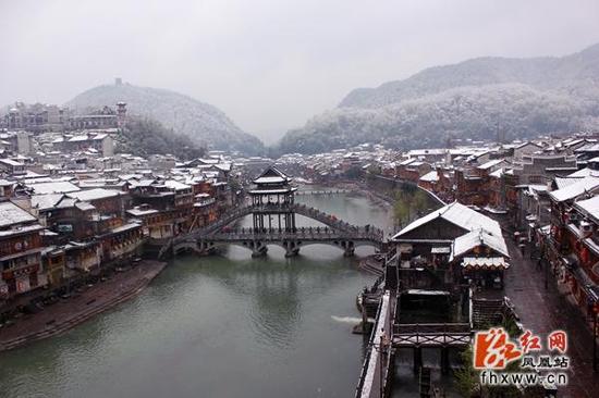 凤凰古城三月降雪 柳绿雪白恍若仙境