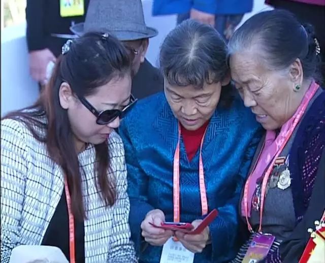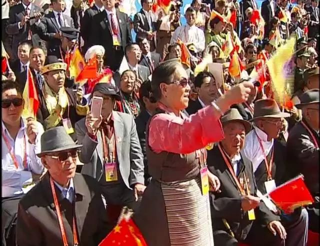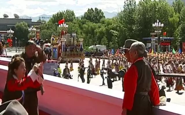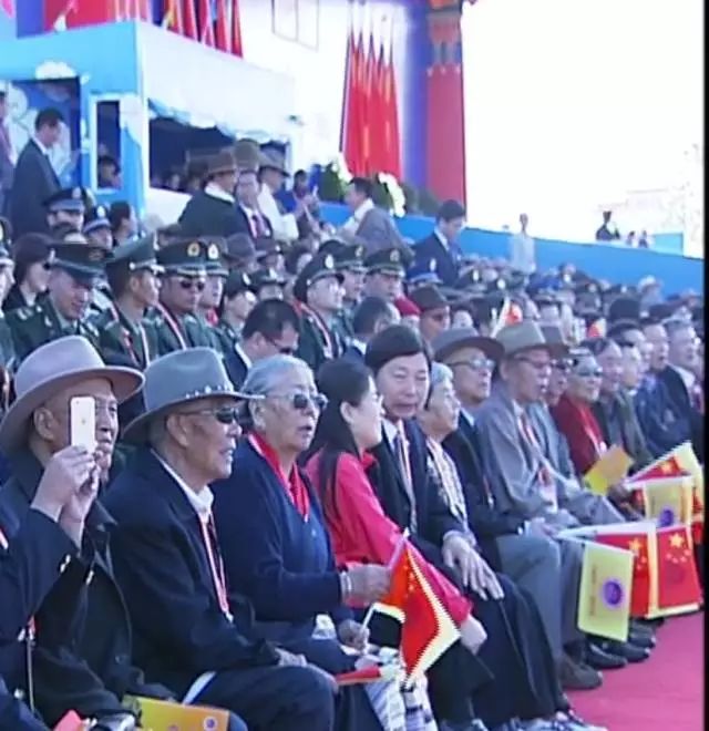 十八军老战士 娜喜每次大庆我都要带着这些勋章,因为它代表着历史,代表着荣誉,一段岁月,它挂在我心上。十八军的子女代表,原西藏自治区党委第一书记阴法唐的女儿阴建白在观礼台上不断的和十八军老战士们合影,并通过微信把照片,发给远在北京的父母,与他们一起分享庆祝大会的喜庆氛围。