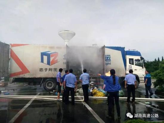 为提高灭火效率,现场工作人员决定从车厢后面进行灭火。服务区经理谢康忠与保安员张义、绿化员文国分工合作,一边喷水一边把快递件往下搬。保洁阿姨在下面协助将快递件搬离安全区域,尽量将车主的损失降低到最低。