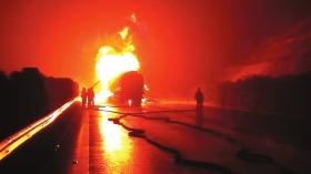 4点38分,栗雨中队消防车终于抵达现场附近。当栗雨中队消防车快接近事故现场时,看见现场有10多米高的“火球”。事故中的两辆车均停在行驶道上并连接在一起,槽罐车上标识着体积为48m3,运输介质为“汽油”。