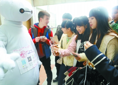 湖南一高校现呆萌“大白” 引众美女大学生围观