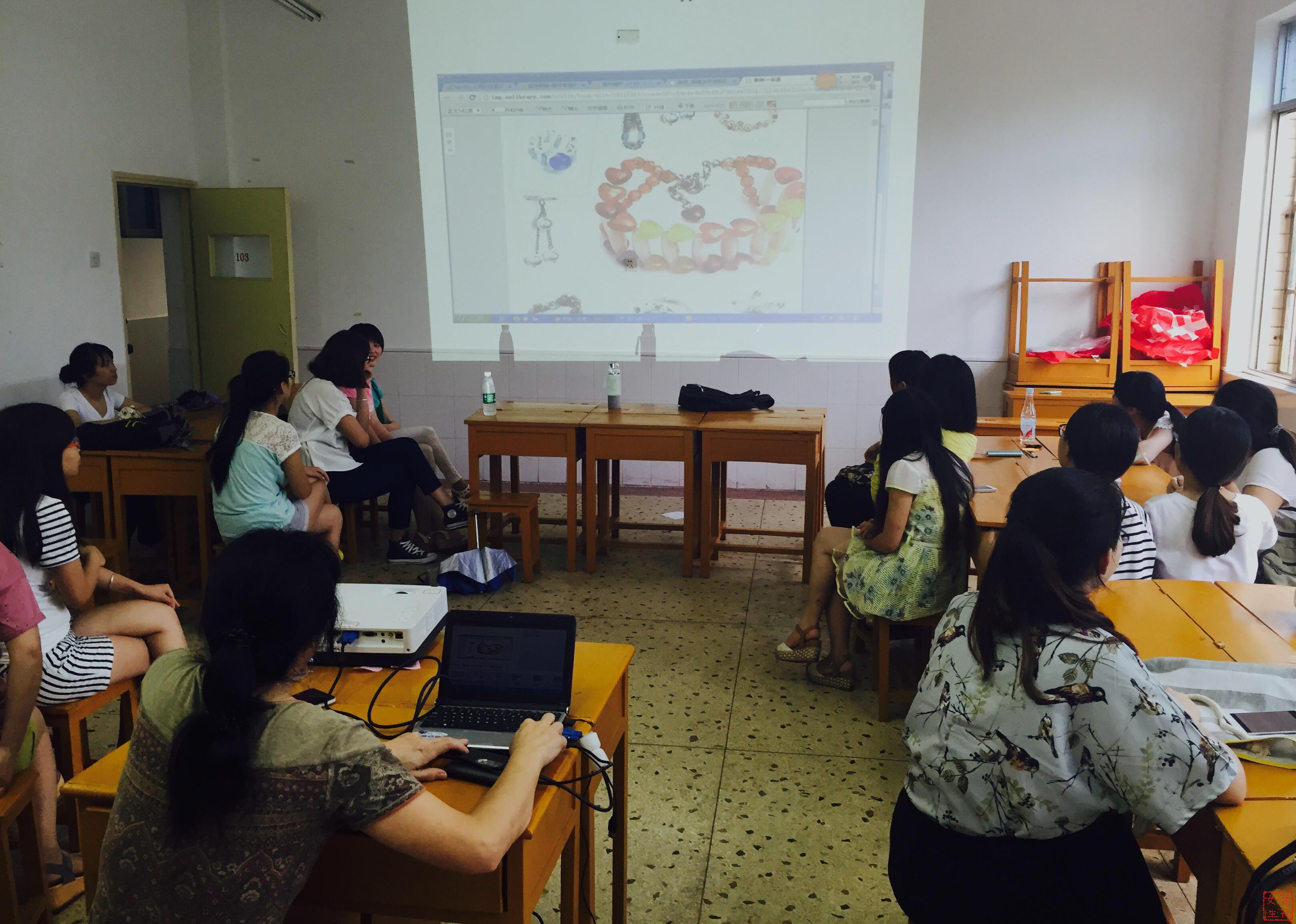 串珠课堂上钟红英教授和学员们一起欣赏串珠佳作