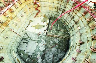 1月16日,大岳高速洞庭湖大桥锚碇深基坑,施工人员在进行混凝土浇筑。两个深度达30米的圆形锚碇承载能力超过30万吨,为目前国内悬索桥最大的锚碇。湖南日报记者 郭立亮 摄