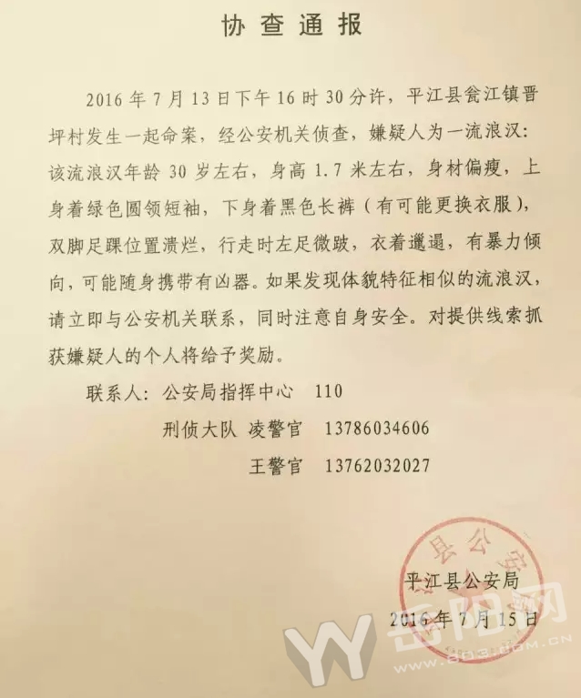 案件发生后,当地公安局关发出一份通告。通告称:2016年7月13日下午16时30分左右,平江县翁江镇晋坪村发生一起命案,今公安局机关调查现请求广大群众协助查找一名可疑流浪汉。