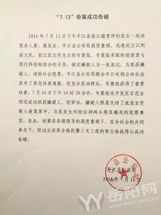 岳阳日报全媒体7月16日讯 (记者 冯 刚)岳阳日报全媒体记者刚刚获悉,“7.13”平江命案于今天下午成功告破,当地公安局随后发出公告。
