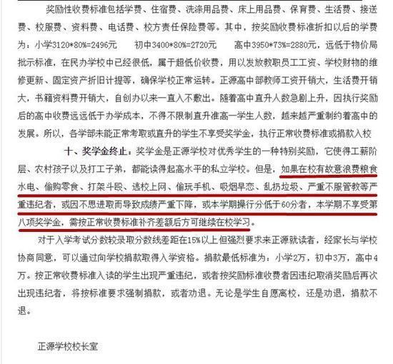 正源学校方面对此的解释是,根据学校的规定,高中部收费8980元/期,实交6580元/期,扣除的2400元是奖学金。如果有学生到校外买零食等违纪情况,将收回奖学金。学校还表示,该条规定已达成家校共识。