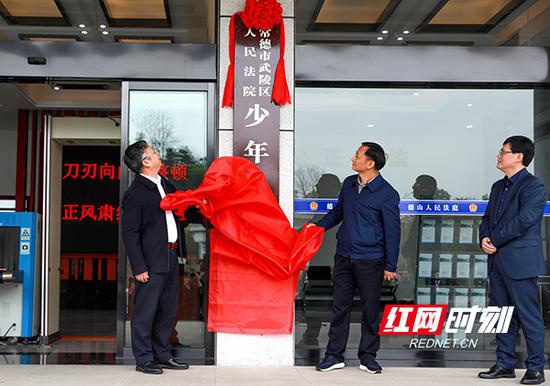 红网时刻3月27日讯 (记者 郑涛 通讯员 李果 粟伟)3月26日,全省法院少年法庭挂牌仪式在常德市武陵区人民法院德山人民法庭举行。湖南省高级人民法院副院长杨翔,常德市委副书记黄清宇共同为武陵区人民法院少年法庭揭牌,这是常德首家挂牌成立的少年法庭。常德市中级人民法院党组书记、院长张经伟出席活动。全国人大代表沈昌健、杜美霜,省人大代表李育智、胡小明,省政协委员丁碧艳、李旋旗应邀参加挂牌仪式。