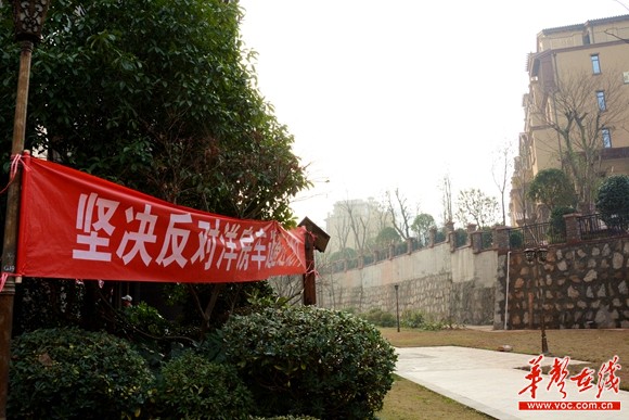 图为业主在小区内悬挂的横幅。记者 龙腾 摄