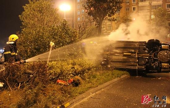岳阳一“应届司机”技术生疏 轿车失控侧翻起火