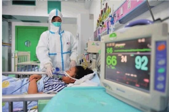 4月25日17时,在湖南省儿童医院重症医学二科的重症隔离病房,三湘都市报记者见到了躺在病床上的晓儿。特护护士邓琼琼穿着防护服正在给她喂晚饭,晓儿努力地张开嘴,想尽量让自己多吃一点。