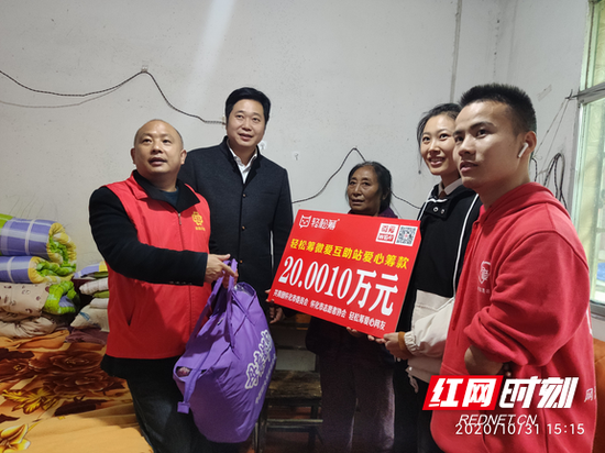 共青团怀化市委书记向胜科与轻松筹微爱互助站志愿者为王美玲同学送爱心网友捐赠善款。王美玲出生于农民家庭,从小就开始学习操持家务,家庭经济拮据。为了帮父母减轻负担,从小学开始,就一直勤工俭学,寒暑假跑去兼职,拾捡矿泉水瓶和废弃书本卖钱,来贴补家用。