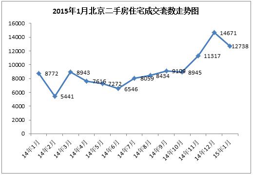 2014年年底以来,北京楼市回暖明显。进入2015年,1月北京二手房成交量较去年12月有所下降,但仍以破万套的成交带给楼市惊喜。据搜房网房天下统计显示,2015年1月北京二手房共成交14236套,较前一个月环比下降13.90%,其中住宅成交12738套。这已是二手房连续第3个月成交突破万套大关。价格方面,1月份北京二手房挂牌均价为37683元/平米,环比增加145元/平米。