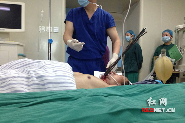 2月26日,一辆救护车飞奔株洲市中医伤科医院,急促的警笛声打破了午后的宁静。车上的伤者是一名55岁的安徽籍男子赵元和(化名)。当天下午,他在株洲市河西某工地做事时,被飞来的7根钢筋从下颌经颈部,贯穿至胸部,目击者无不称恐怖至极。