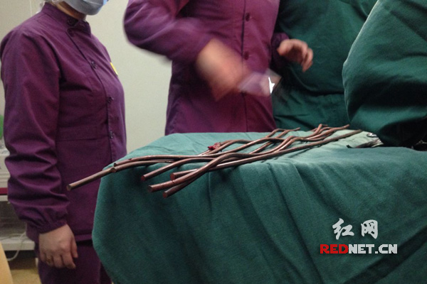 每一根钢筋被拔出,医生们就松了一口气,下午6点钟,第7根钢筋被成功取出,随后医生对伤者的伤口及刀口进行了清创缝合。