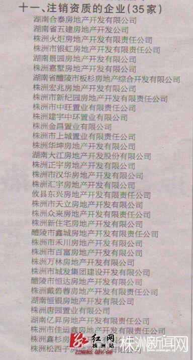 株洲新闻网4月25日讯(记者 刘苏宁)日前,株洲市房产管理局对2015年度株洲市房地产开发企业资质年检结果进行了通报。88家企业年检不合格,其中湖南合泰、株洲火炬、株洲城发等 35家企业被注销资质。在未处理解决好遗留问题,这些企业不得再从事其它房地产开发经营活动。