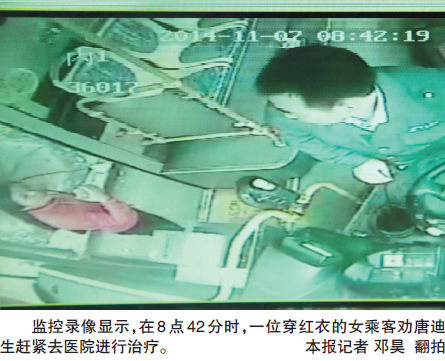 事后从监控视频中可以看到,11月7日上午8点42分19秒,红衣女子最后一位下车,下车前,提醒了唐迪生“如果身体不行,就去医院”。尽管驾驶员轻声地回答了她,但她还是不放心,8点42分33秒她又提醒了一次,但唐迪生因头疼,捂着额头靠在了方向盘上。