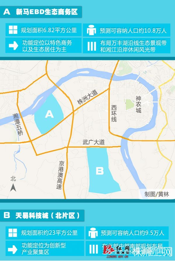 市规划局相关负责人介绍,两大片区规划都非常注重生态开发理念。天易科技城北片区依托水系和绿地景观,在北部、中部、南部分别布局三条生态绿化景观带;而新马EBD则布局有万丰湖沿线生态景观带和湘江沿岸休闲风光带。