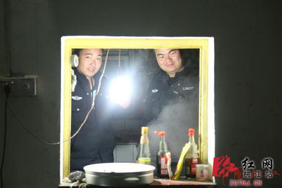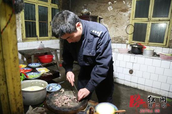 大年三十晚上8点半,出警回来,副所长吴仲华带着大家做起了年夜饭。因为大栗港镇街上的商店大多关门,只有一些很简单的菜。