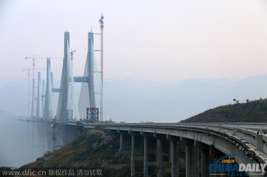 赤石特大桥是世界第一大跨径高墩多塔混凝土斜拉桥,该桥由湖南省交通规划勘察设计院,桥梁设计为4塔双索面预应力混凝土斜拉桥,主塔最高达286米,平均高度约270米,桥面距地面最高达183米,最大跨径380米,主桥全长1470米。