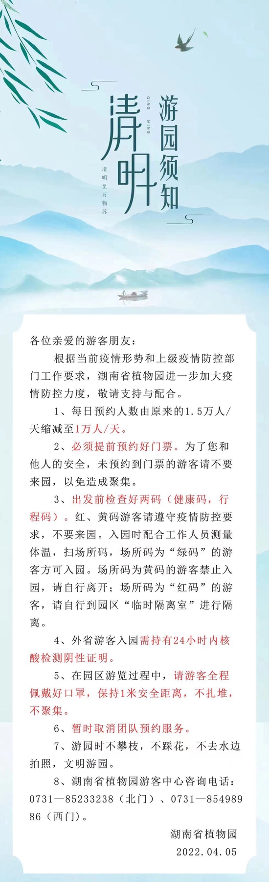 游客在园区游览过程中,请全程佩戴好口罩,保持1米安全距离,不扎堆,不聚集。景区暂时取消团队预约服务。湖南省植物园游客中心咨询电话:0731—85233238、0731—85498986。