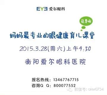 衡阳爱尔眼科医院“妈咪课堂”3月28日(本周六)上午9:30开讲,从专业角度对孩子配镜和青少年近视防控等相关问题进行客观权威的解答,让未近视的孩子远离近视,让已近视的孩子减控近视增长速度,让所有的孩子们在轻松的氛围中学习到实用的眼健康知识,孩子视力好,学习少烦恼!