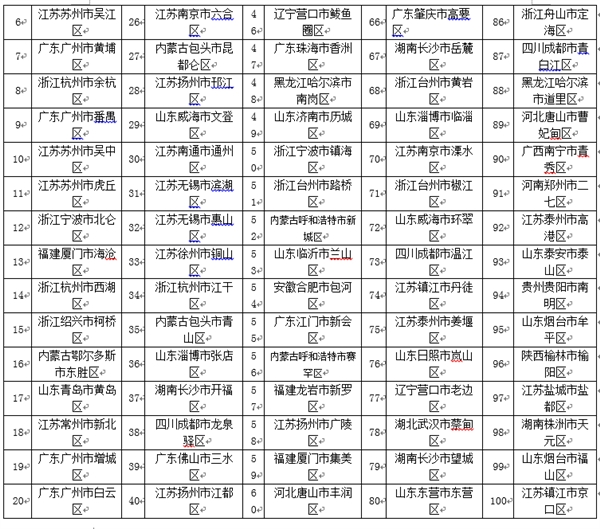 同样来自江苏的江阴、张家港和常熟分列第二至第四名,太仓也拿到了第七。